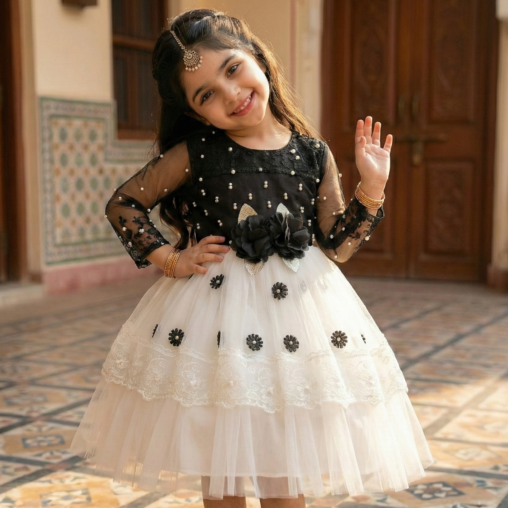 The skirt layers soft pink tulle over white, finished with a delicate white lace border. It represents premium quality and sophisticated style, ensuring your little girl is the center of attention.