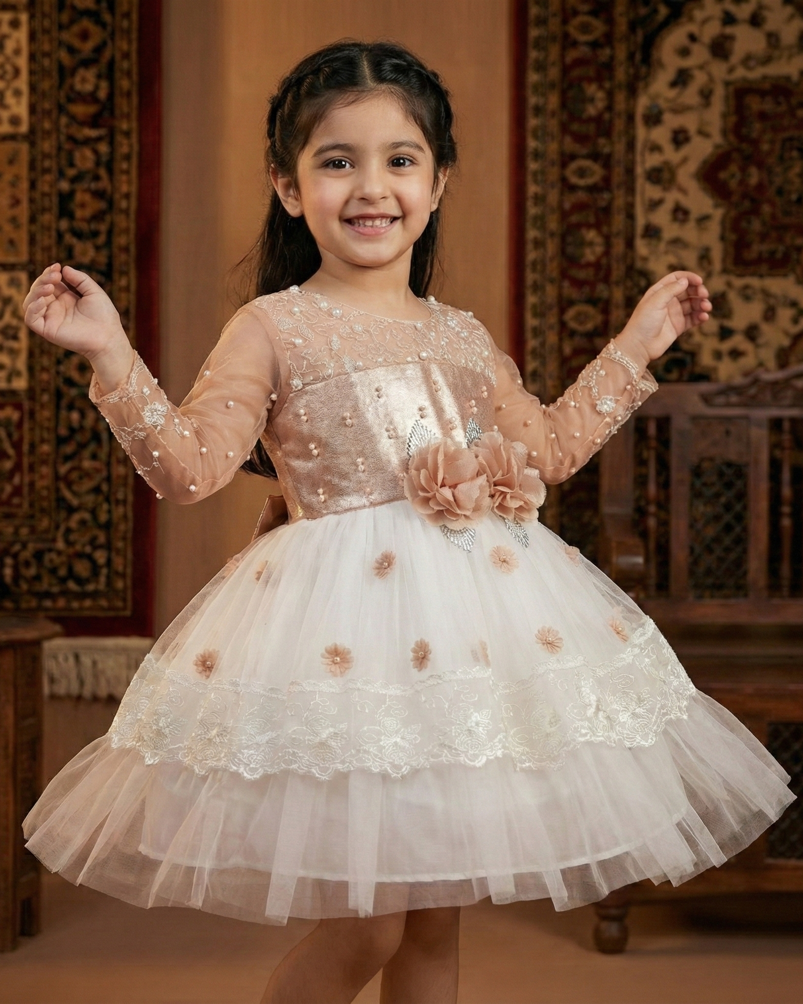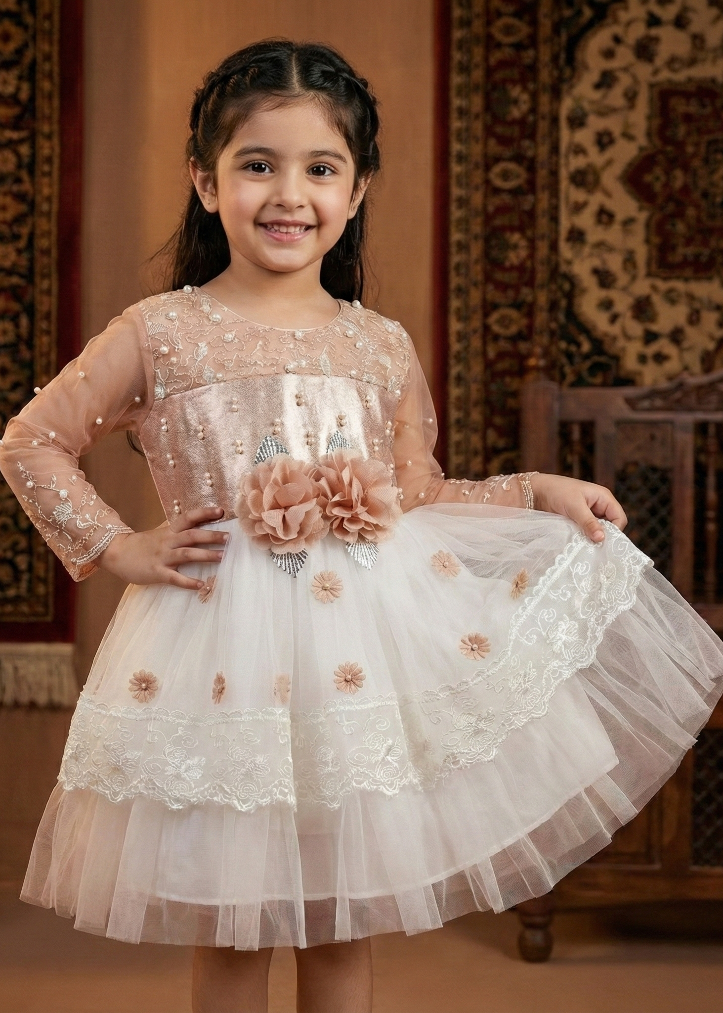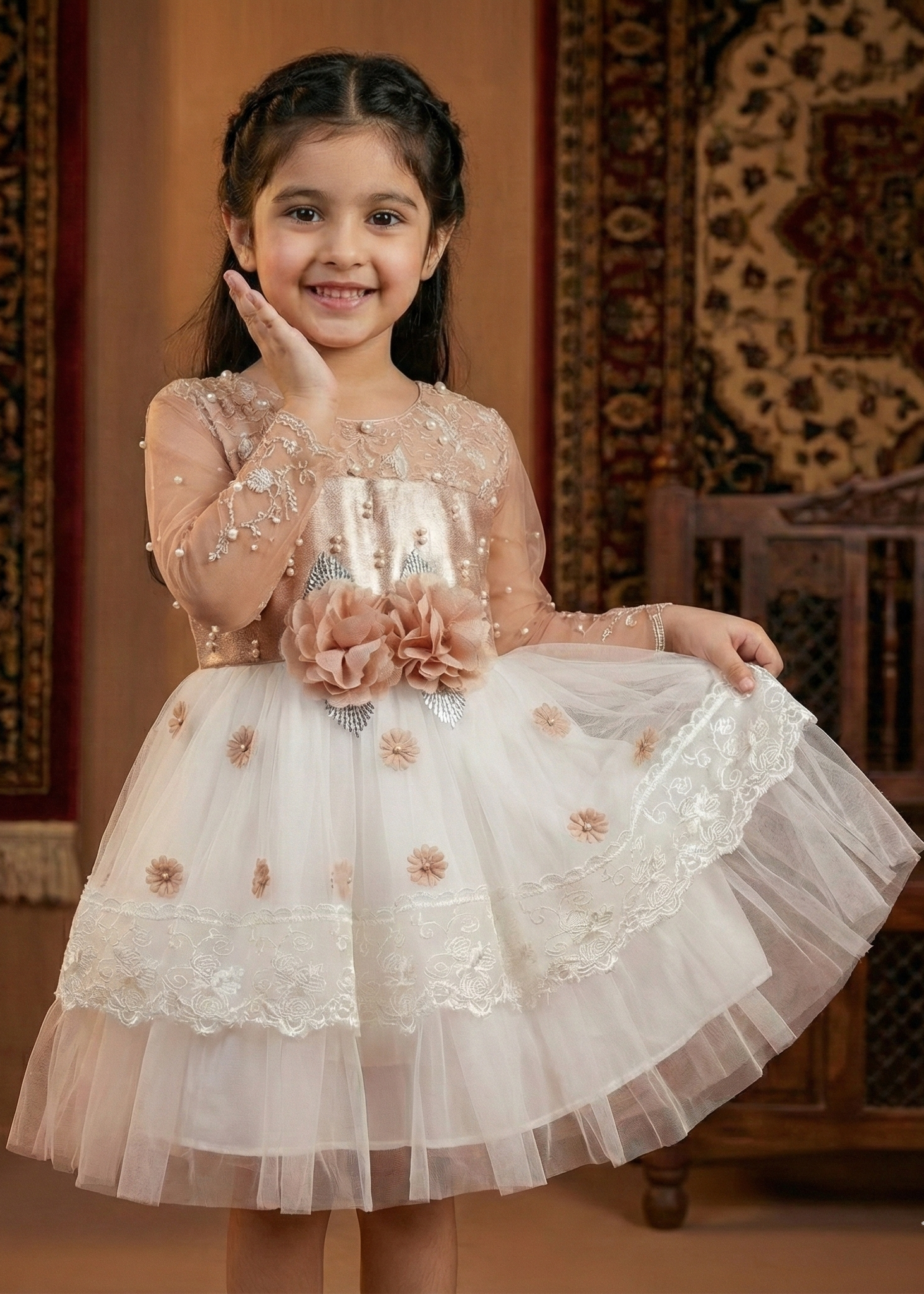 Capture the magic of childhood with our Blush Pink Floral Princess Gown. This soft pink masterpiece is the definition of elegance. Featuring a pearl-studded bodice and a large, beautiful 3D flower at the waist, this dress is designed to make your little one shine.