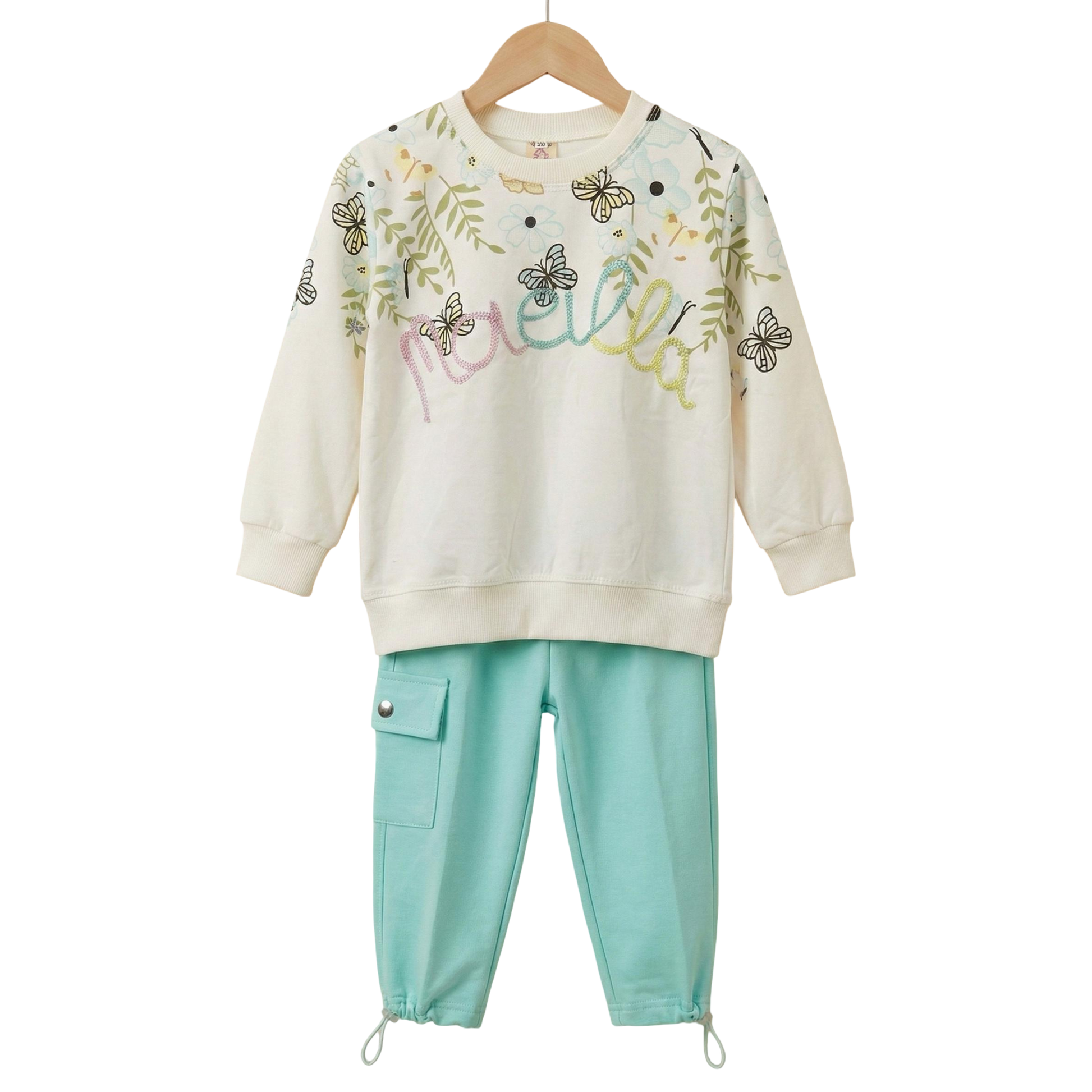 Dress your little girl in soft, stylish comfort with this beautiful floral & butterfly sweatshirt paired with aqua cargo-style trousers. Perfect for casual days, outings, and active play.
