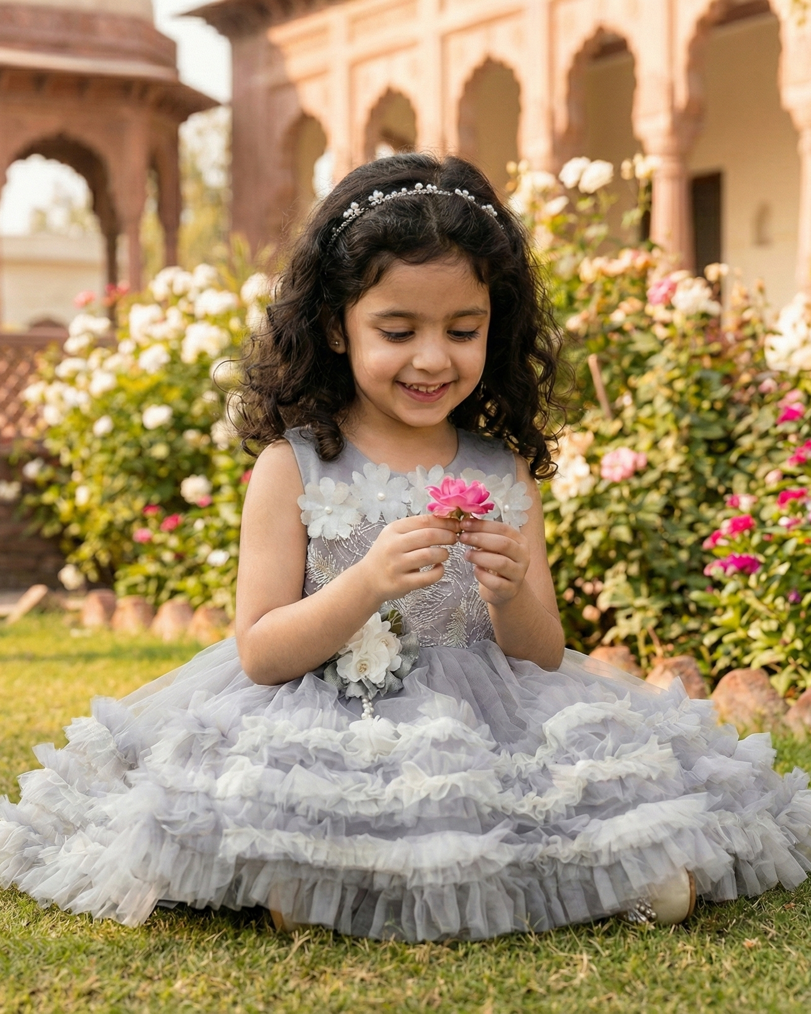 Transform your little girl into a fairy-tale princess with our Grey Enchantment Floral Tulle Dress. This masterpiece is designed for those special moments where style meets comfort. Featuring intricate floral appliqués with pearl detailing on the bodice and a voluminous, multi-layered ruffled skirt, this dress is the definition of elegance.
