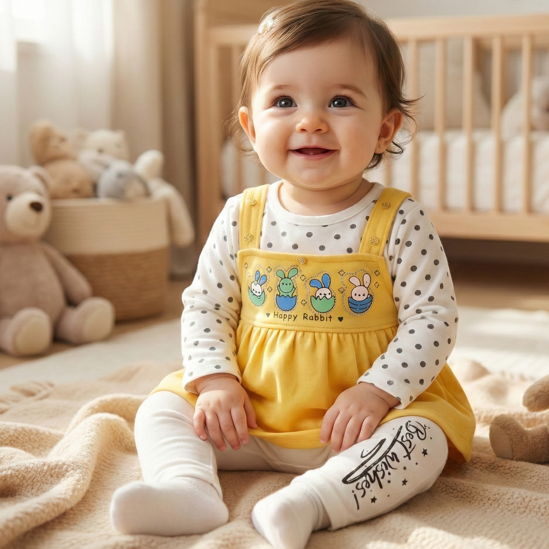 The Happy Hoppers Yellow Bunny Set is designed for maximum cuteness and all-day comfort. This adorable 2-piece outfit features a sunny yellow pinafore-style dress with a playful "Happy Rabbit" graphic, paired with a cozy polka-dot top and matching leggings that say "Best Wishes" for that extra touch of charm.