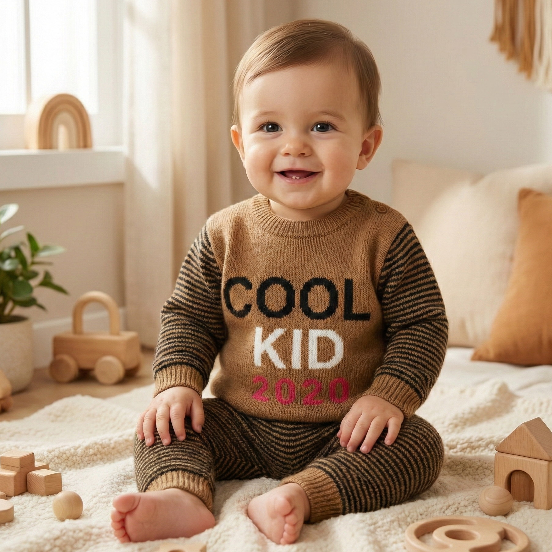 Crafted from premium, ultra-soft fleece, this set features a frock-style top with a charming polka-dot upper panel and delicate floral embroidery. The ribbed high-neck and soft cuffs seal in warmth, while the matching trousers ensure comfortable movement for crawling and playing. It’s the perfect blend of traditional warmth and modern cute style.