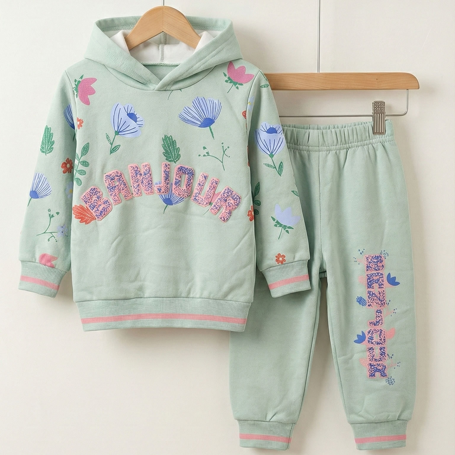 Introduce some fresh style to your little one's winter wardrobe with our new "Bonjour" Floral Mint Hoodie & Trouser Set, exclusively at Panda Pals Kids.