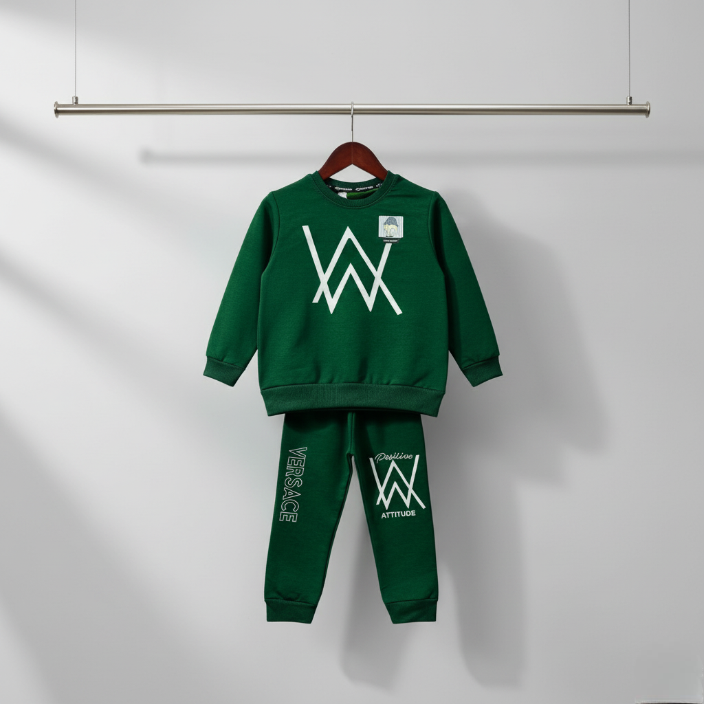 The set features a classic crewneck sweatshirt with a striking geometric "W" logo and matching joggers with stylish typography details. Whether it's a playdate or a family outing, this outfit ensures your boy looks sharp and stays cozy.